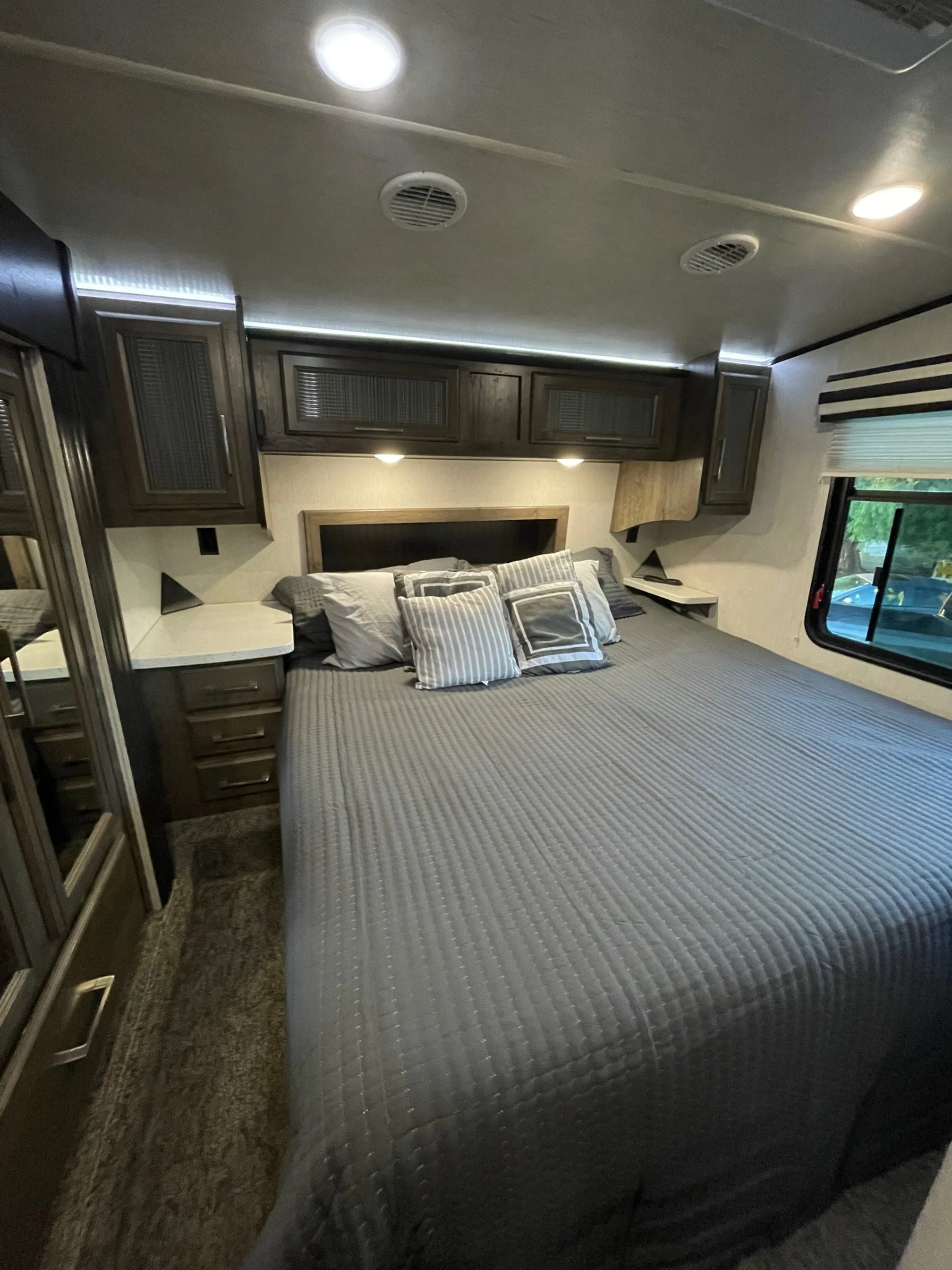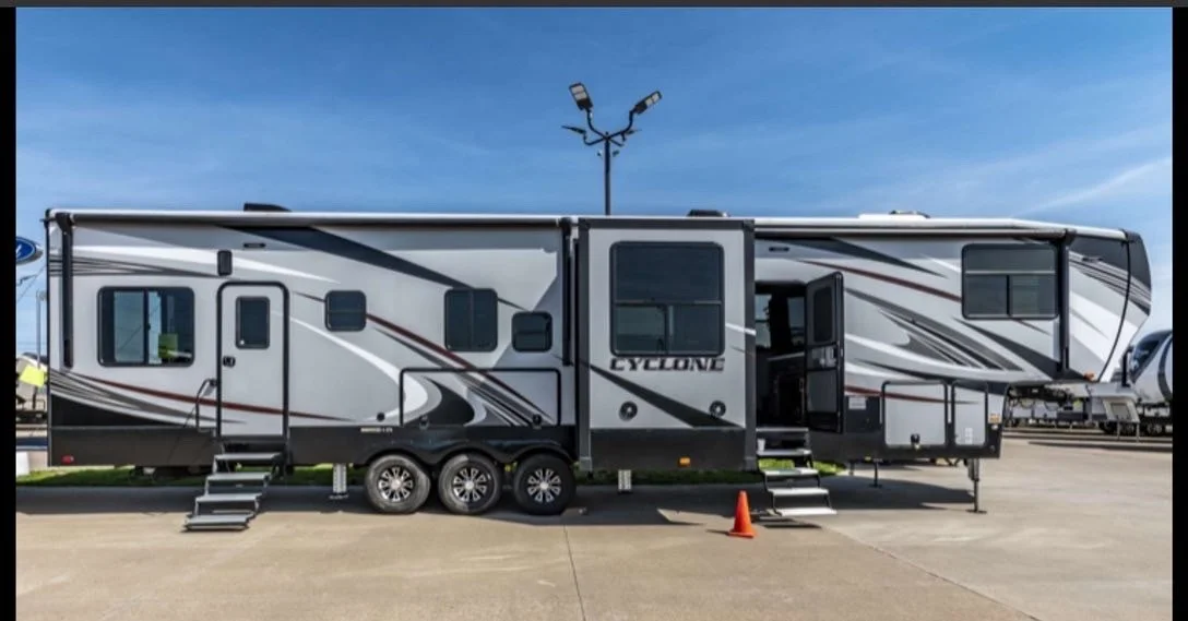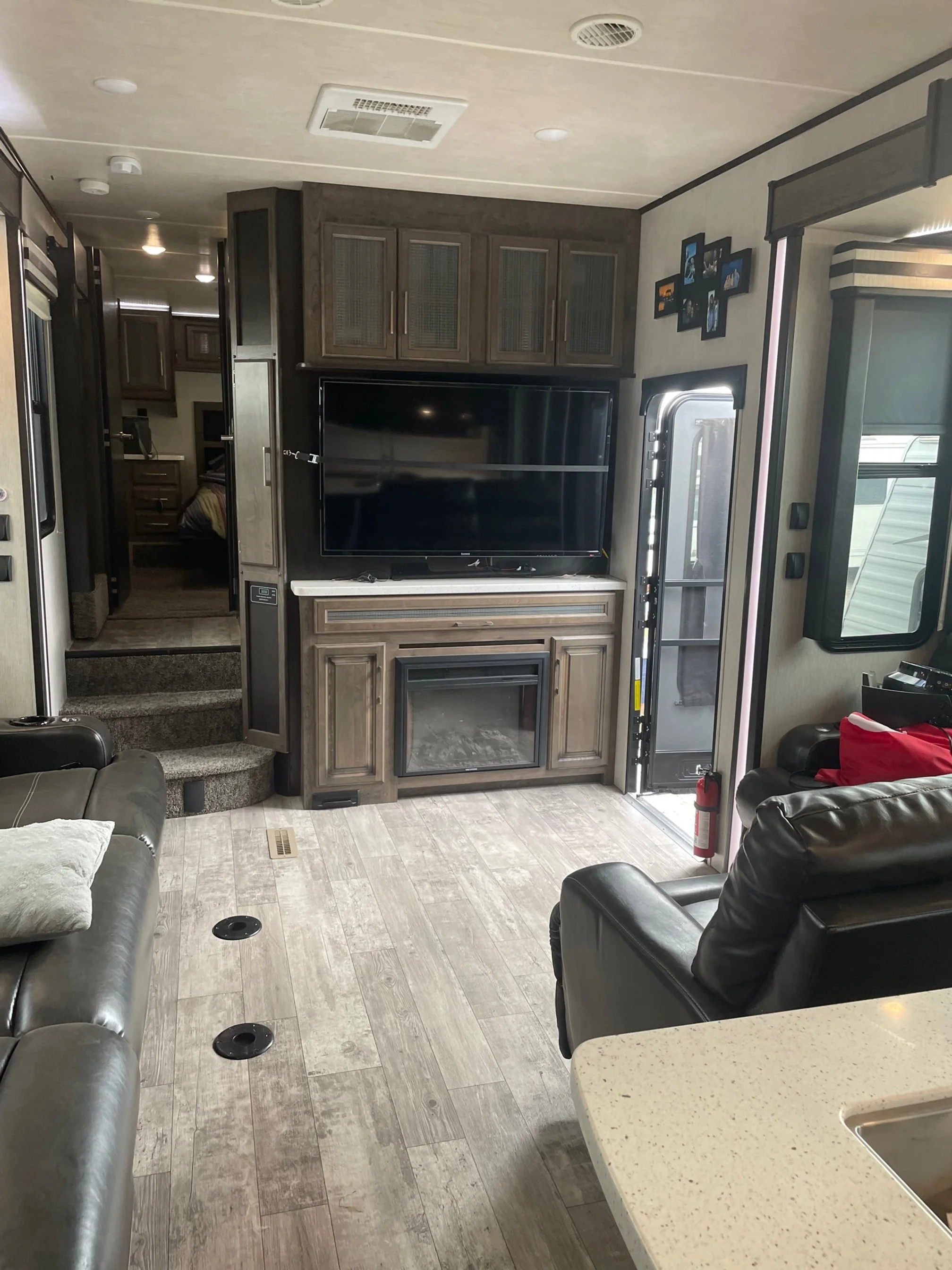 Sleeps up to 10 people. Has a king bed up front with two queens in the rear. Loft bed and Half bath in rear. Trailer is stocked with pots, pans, silverware, and cooking utensils, has three AC unit, and four TVs.