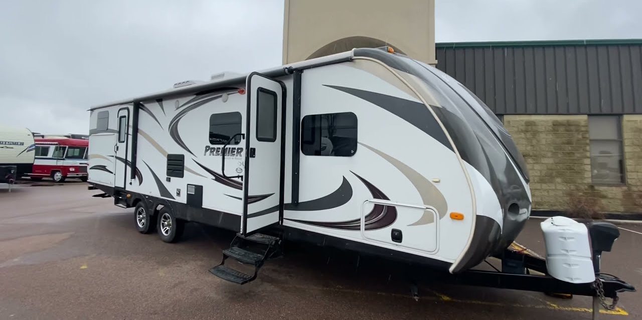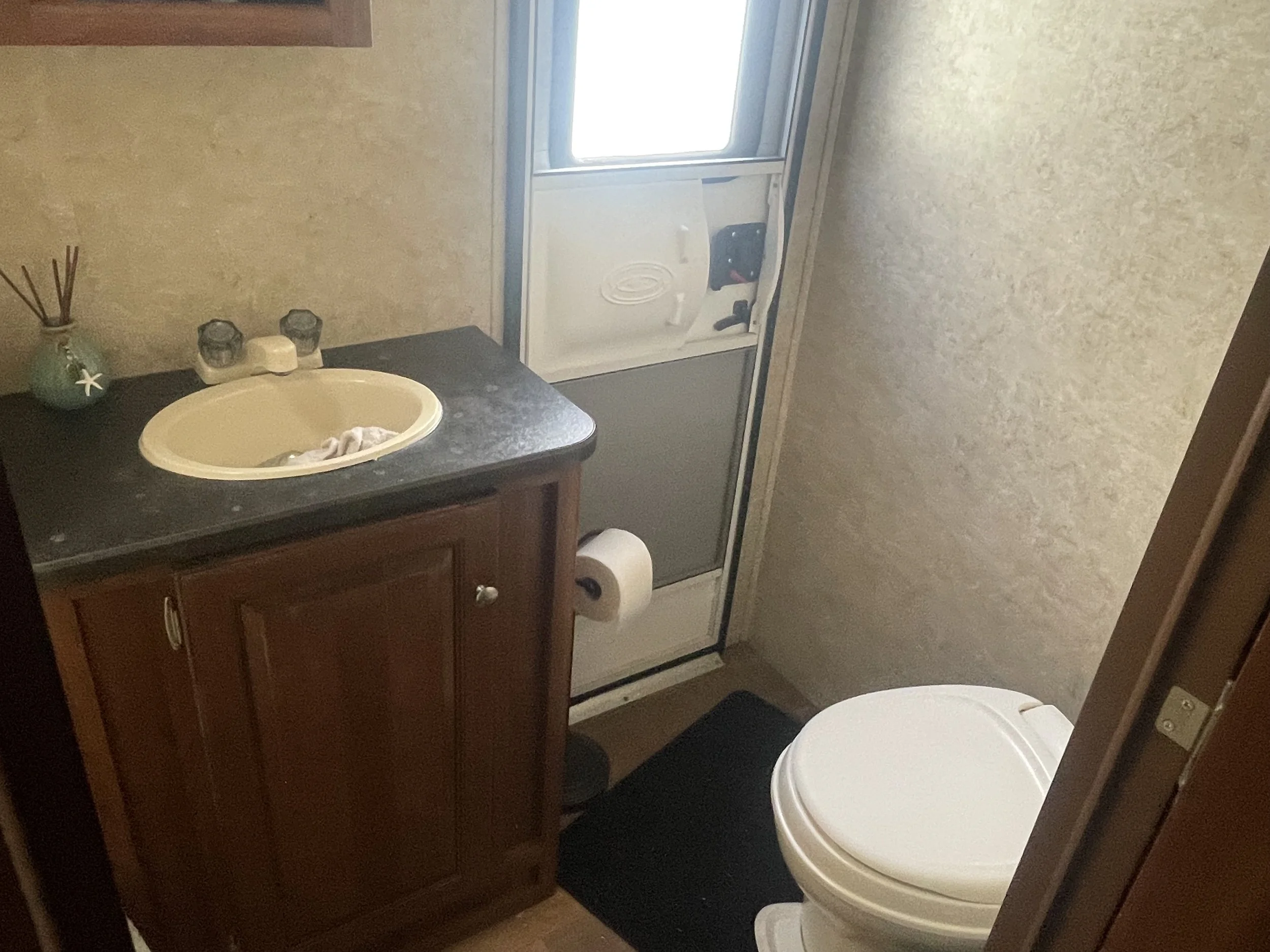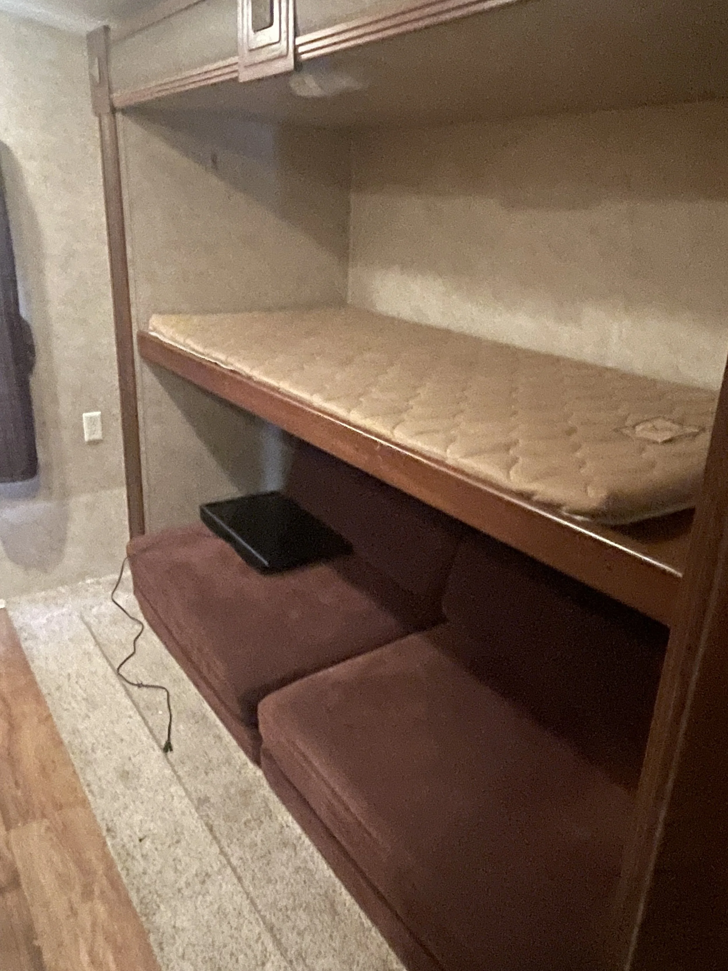 Sleeps up to 9 people. Has a queen bed up front with three single bunks in the rear. Kitchen dinette and couch turn into additional bed. Trailer is stocked with pots, pans, silverware, and cooking utensils, has one AC unit, and one TV.