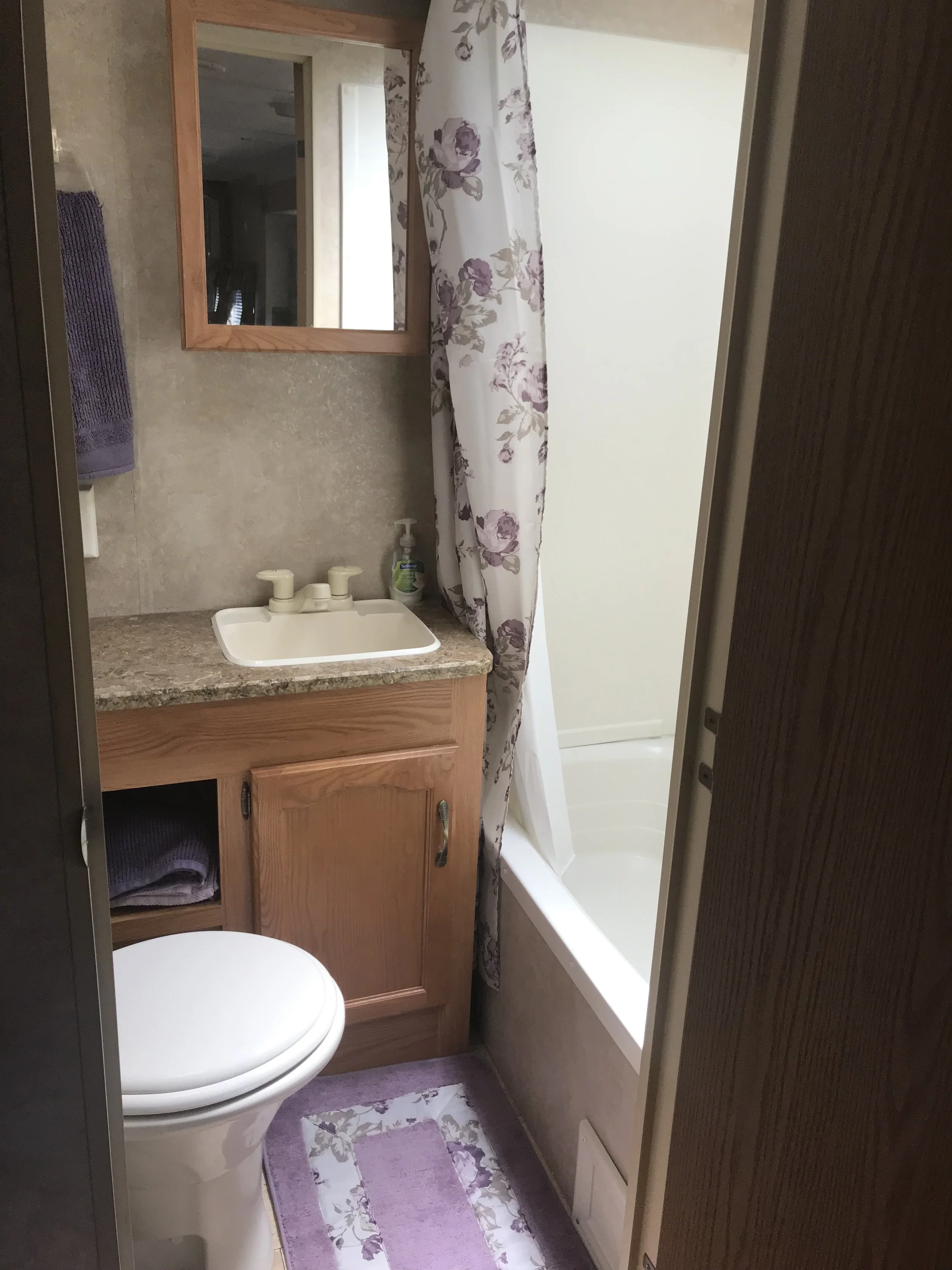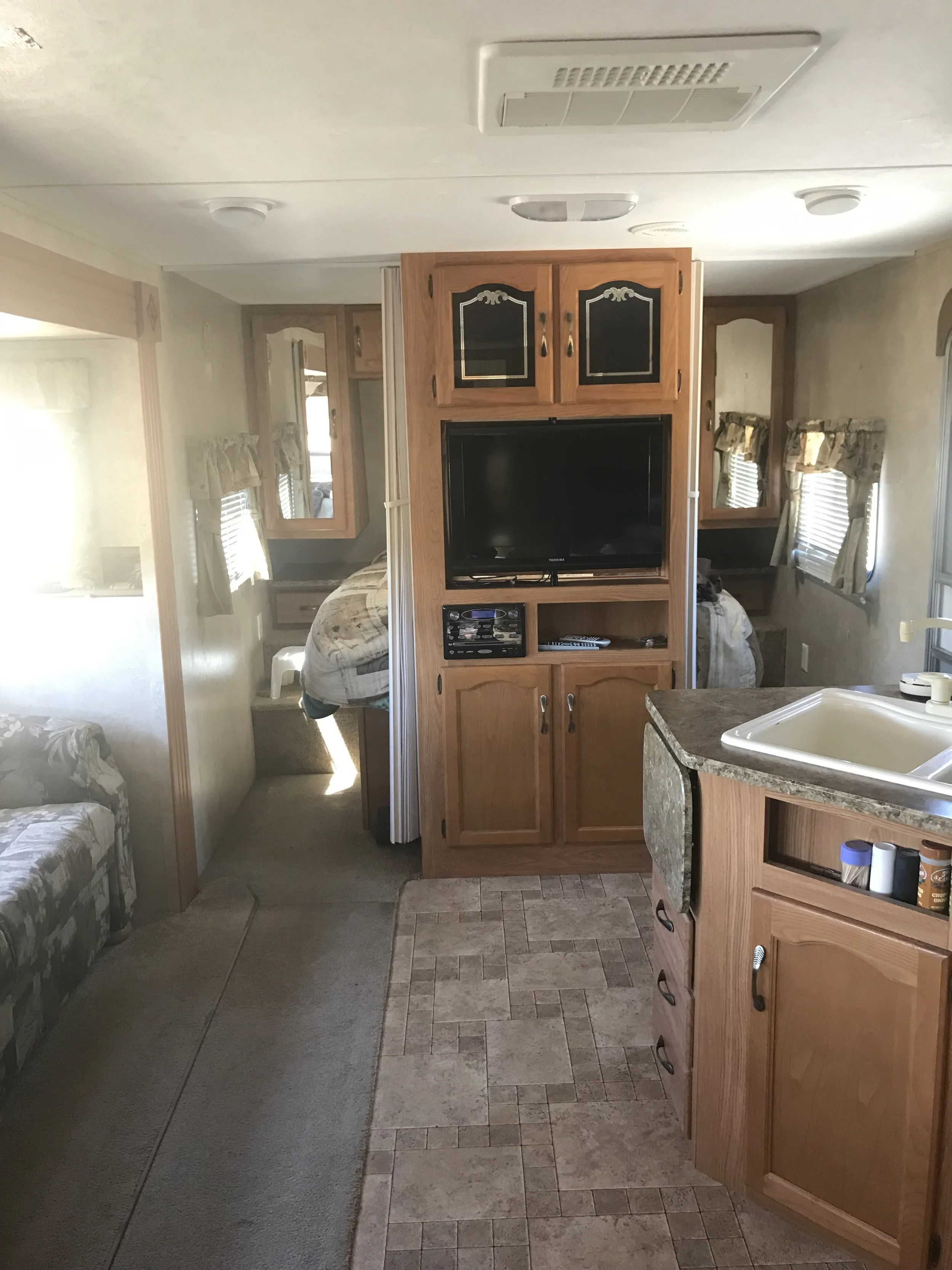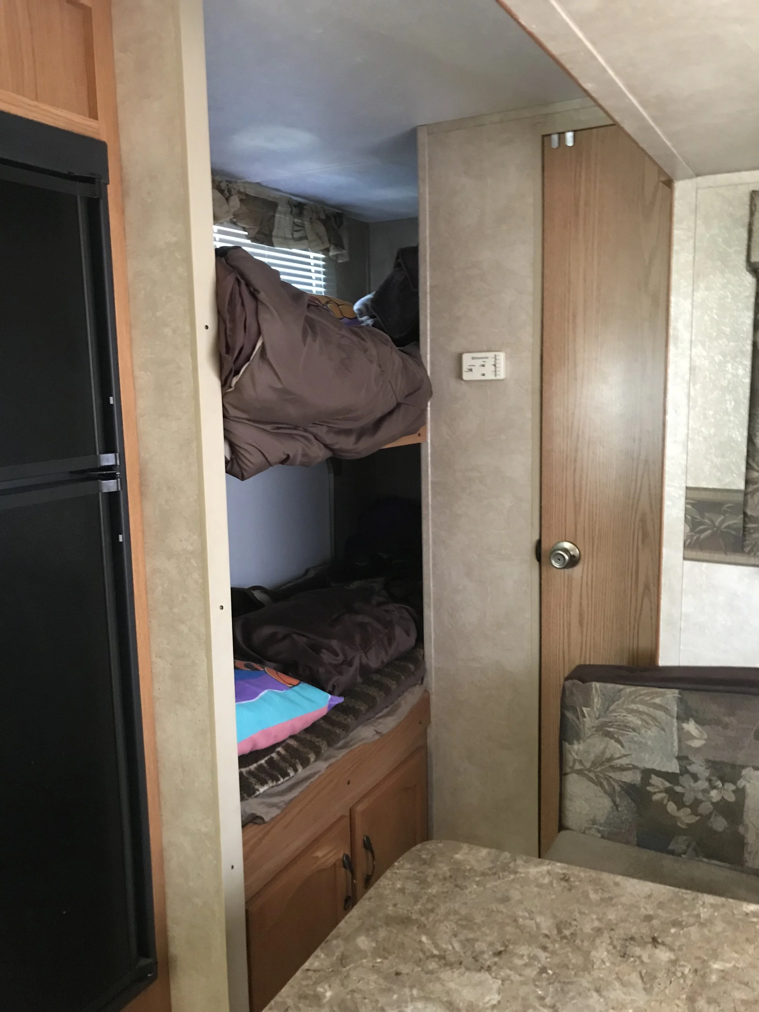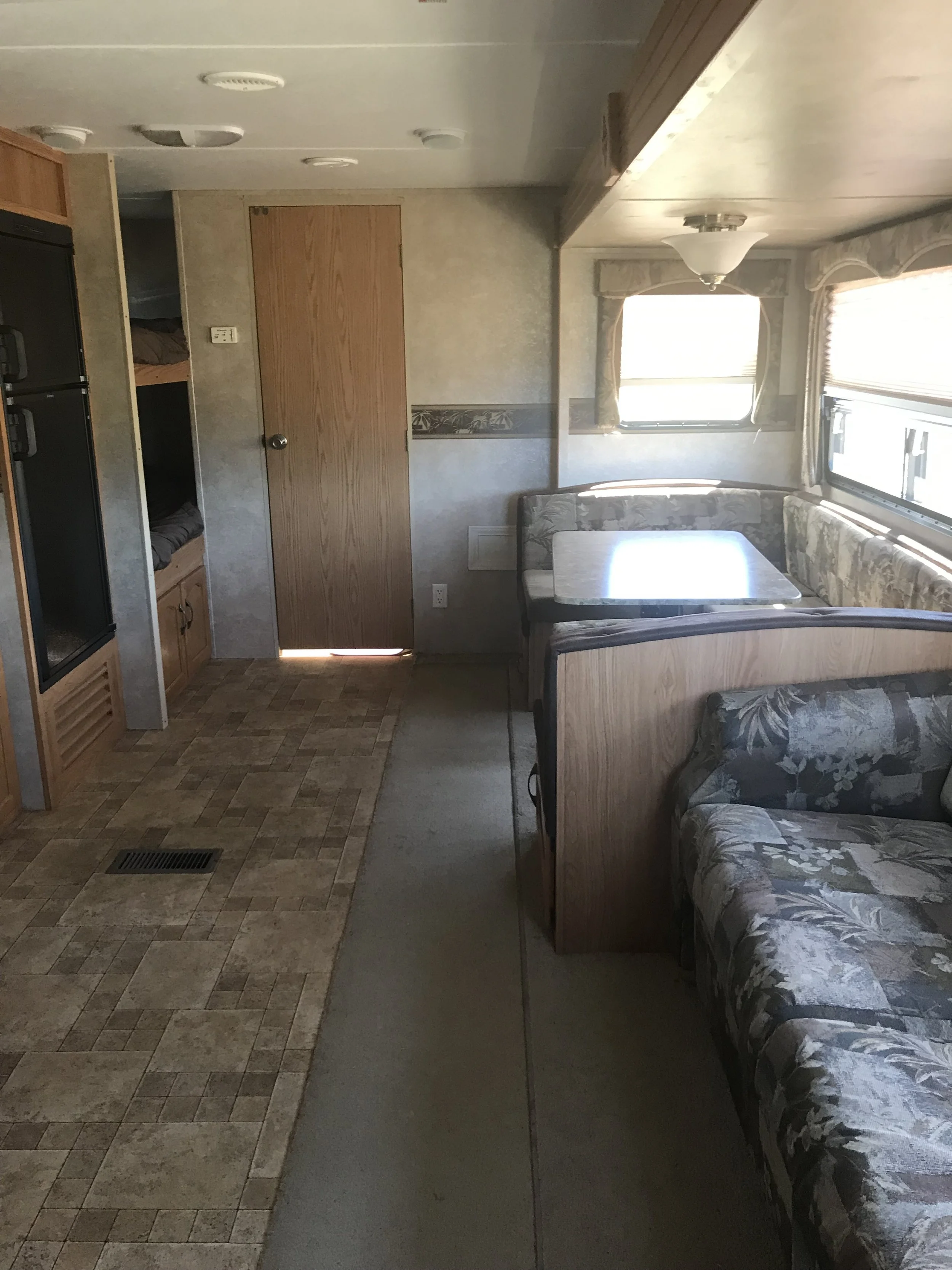 Smaller trailer for a small group of 4-6. Has a queen bed up front with two single bunks in the rear. Kitchen dinette is U-shaped and converts to an additional bed. Trailer is stocked with pots, pans, silverware, and cooking utensils, has one AC unit, and one TV.